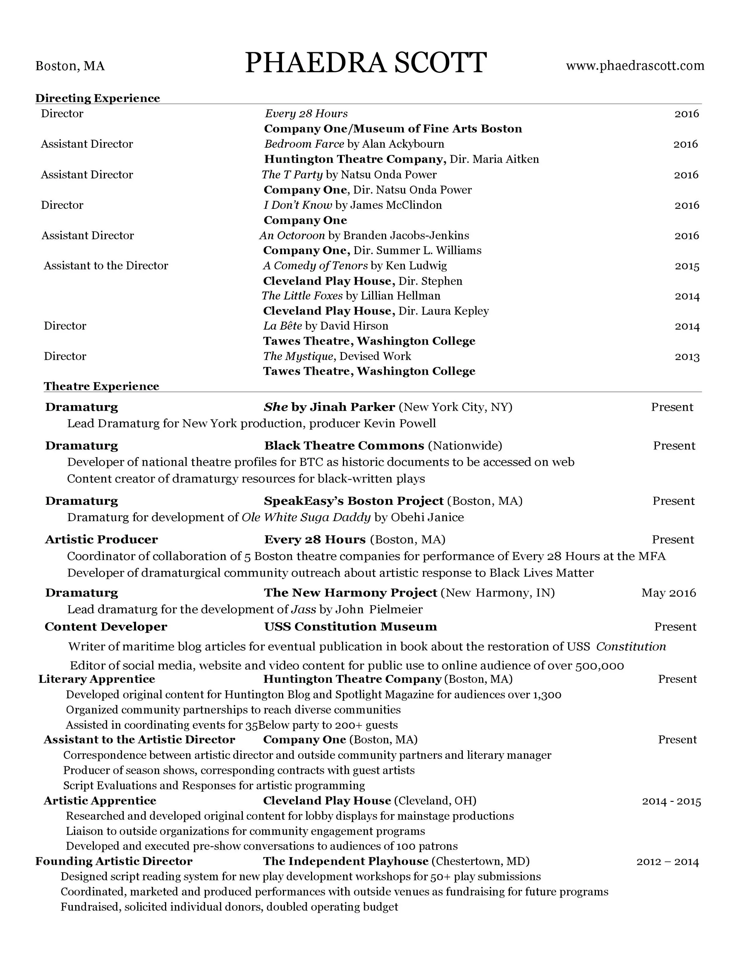 Phaedra Scott is a Boston based director, dramaturg and writer. Phaedra has been a part of the artistic departments of Cleveland Play House, Huntington Theatre Company and Company One Theatre. She recently Produced Every 28 Hours in collaboration with Company One Theatre and the Museum of Fine Arts in Boston. Directing Credits Include: I Don't Know (Company One), Every 28 Hours (Company One/MFA). She has assistant directed Bedroom Farce (Huntington Theatre Company), An Octoroon ( Company One). Phaedra's recent dramaturgy credits include How Soft the Lining (Bad Habit Productions), Jass (New Harmony Project), Can You Forgive Her? (Huntington Theatre Company. She is a dramaturg for the second season of the Boston Project at SpeakEasy Stage on the play Ole White Suga Daddy. She is the recipient of the Early Career Dramaturgs Grant, the Comegys Bight Fellowship and the Frederick Douglass Fellowship for her work on August Wilson's Pittsburgh Cycle. She is also a crocheter, journalist and obscure history enthusiast.